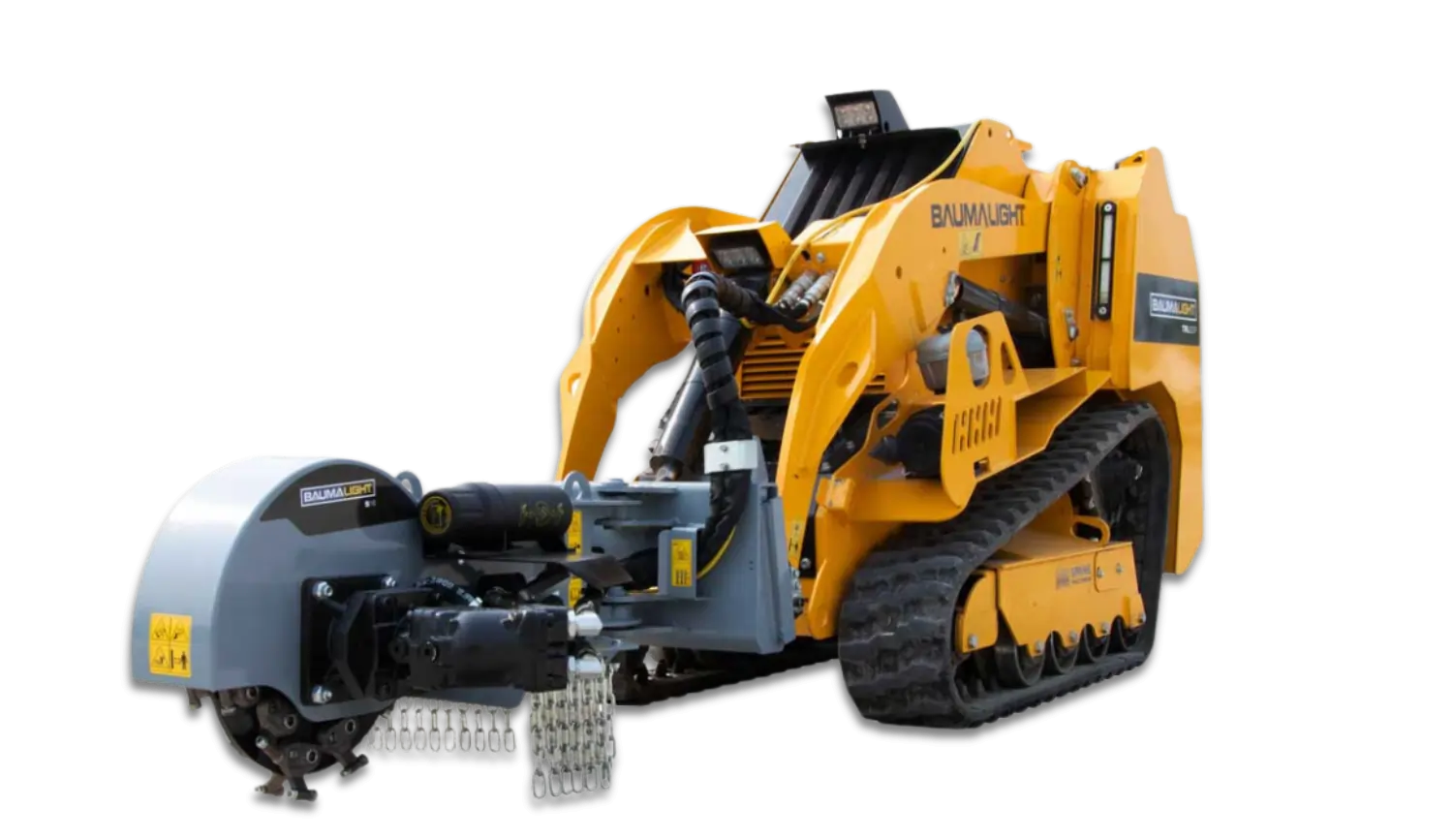 Experience unmatched stump grinding precision with the Baumalight S16 Mini Skidsteer Stump Grinder, featuring an electric actuator that expertly controls side-to-side swing and robust 12VDC electric linear actuators with IP69-rated stainless steel bodies. Its double-sided tooth rotor speeds up operations, while the unique concave carbide tips ensure aggressive cutting.